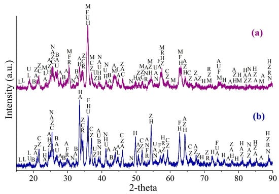 To simulate equilibrium states at roasting conditions, HSC Chemistry 9.9 software (Outotec, Pori, Finland) [52] was used. Equilibrium compositions were calculated at 300–900 °C using 100 kg of ZPR at P = 0.1 MPa and model gaseous phase containing 79 at. % N2 and 21 at. % O2. The ZPR composition was calculated according to the results of elemental, XRD and chemical phase analysis. Components of insignificant contents, as well as missing or doubtful thermodynamic data, were neglected from the calculation. Table 1 lists the model composition for the thermodynamic simulation.