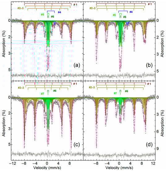 Low-intensity sextet is hematite [63] due to a specific temperature dependence of the quadrupole shift of α-Fe2O3 caused by the Morrin transition [64]. Obviously, hematite in ZPR appears during oxidation of iron sulfides during the roasting in fluidized-bed furnace.