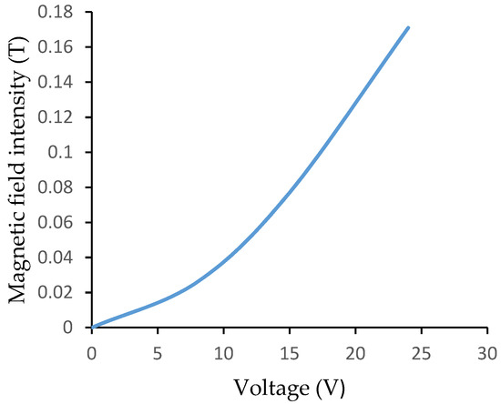 The electromagnet used in this research is studied for its magnetic field intensity as a function of applied voltage. The gaussmeter (Nunes Instruments, Coimbatore, India) is used to measure the magnetic strength at the distance of 4 mm from the electromagnet and the magnetic field intensity for different set of input voltages applied to the electromagnet is recorded. The measurement of magnetic field intensity is shown in Figure 4.