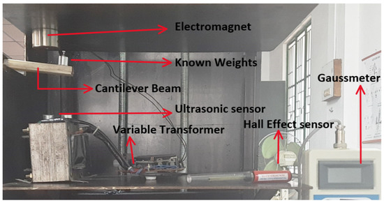 The load–displacement relationship of the flexible PVC-MR fluid cantilever structure is measured for the voltage range of a magnetic flux densities. The beam is initially deflected after packing the MR fluid in the cantilever structure due to the uniformly distributed mass of the MR fluid and the structure’s self-weight. The structure’s initial displacement is 5.59 mm when it is not loaded with external weights. An ultrasonic displacement sensor (HC-SR04) measures the displacement of the cantilever structure at its free end. At 0.026 T, 0.077 T, and 0.171 T, the initial displacement of the cantilever structure without external load is 4.43 mm, 2.78 mm, and 1.13 mm, respectively. The known weight (10 g, 20 g, 30 g, 40 g, and 50 g) is now placed at the structure’s free end. The displacement of each load at the free end is monitored using an ultrasonic displacement sensor. By subtracting the initial displacement from the sensor’s measured displacement value, the actual displacement is calculated. Figure 6 shows the experimental setup where ultrasonic displacement sensor is placed at bottom of the free end of the beam and the voltage of the electromagnet can be varied by using the variable transformer. For different magnetic field intensity, the corresponding deflection of beam with respect to the external load applied is measured.