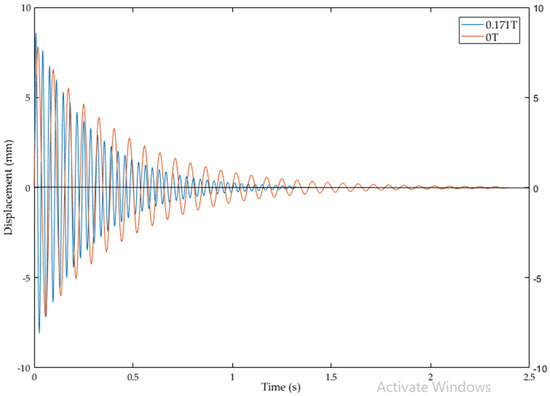 The vibration response of cantilever structure with MR fluid at 0 T and 0.171 T is compared in Figure 7. It is proved that by increasing the magnetic field intensity the damping ratio and logarithmic decrement are increased. The damping ratio is increased by 44.5% due to the increase in magnetic field intensity from 0 T to 0.171 T. The vibration amplitude is suppressed with influence of external magnetic field. The plot shows that underdamping is achievable with MR fluid in these magnetic flux densities. Thus, these structures have applications limited to underdamping engineering problems.