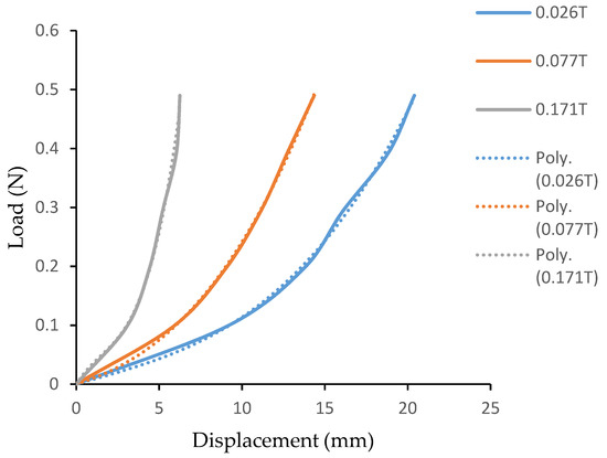 The stiffness behavior of the structure with core layer as MR fluid at different magnetic field intensity is measured (Figure 8) from the stiffness characterization experiment. The deflection of flexible PVC-MR fluid beam for different external load with respect to applied magnetic field is studied. The load displacement curve shows non-linear elastic deformation. Due to its non-linear behavior, the load- displacement curve is constituted by a polynomial function using non-linear regression as shown in Table 3. The displacement decreasing for increase in magnetic flux density for same load applied is observed. It proves that the stiffness increases with increase in magnetic field intensity. This property allows the tunable stiffness nature of structure for the desired range. The stiffness characteristics of flexible cantilever structure shows that the use of magnetic responsive material as core is functional in control of damping and stiffness. The load–displacement curve is determined experimentally. The average stiffness is increased by 226.66% due to increase in magnetic field from 0 T to 0.171 T. Table 4 represents the field dependent stiffness of the cantilever structure with MR fluid. It is obtained by differentiating the polynomial function in Table 3. The notations y, x and k represent load, displacement and stiffness respectively. These polynomial functions will be used in development of controller for adaptive structures applications involving flexible PVC–MR fluid cantilever structure.