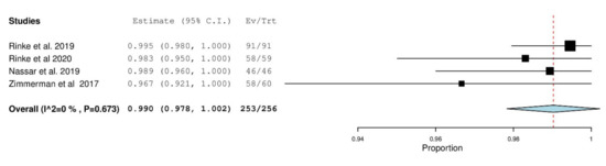 After quantitative analysis, the 1 year overall survival rate of PICN was determined to be 99.6% (p < 0.001) and 99.5% (p < 0.001) over 2 years demonstrated in Figure 2 and Figure 3 respectively. The 1 year overall survival rate of ZLS was 99% (p < 0.001) as demonstrated in Figure 4. The length of the survival rates analysed were limited by the study with the shortest follow-up durations. Due to the differences in classifying failures of restorations, the survival data from Rinke et al. [42] was manually recalibrated such that debonding was reclassified as an absolute failure. Recalibration was unable to be conducted for Oudkerk et al. [40] due to insufficient information reported in the study to accurately recalibrate the survival data. There is a low amount of heterogeneity amongst studies investigating PICN and ZLS given the I2 value of 0% [35].