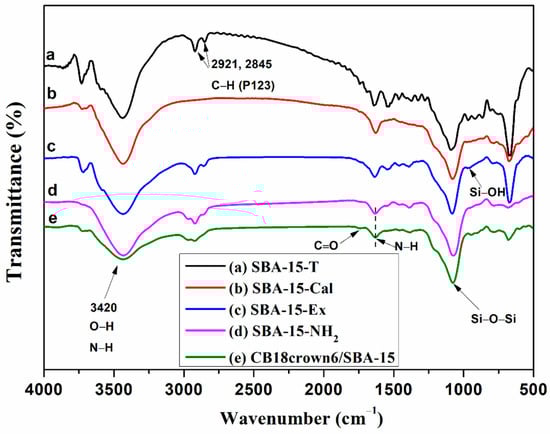 FTIR spectra of (a) SBA-15-T, (b) SBA-15-Cal, (c) SBA-15-Ex, (d) SBA-15-NH2, and (e) CB18crown6/SBA-15.