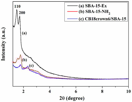 The XRD patterns for SBA-15-Ex, SBA-15-NH2, and CB18crown6/SBA-15 are displayed in Figure 2. All of these samples exhibit two characteristic diffraction peaks in the range of 1.2°–2° that can be indexed to (110) and (200) diffraction associated with two-dimensional hexagonal symmetry (P6mm) [28,29]. The results indicate that after modification of SBA-15 with CB18crown6, CB18crown6/SBA-15 still shows ordered mesopores with uniform pore size. The intensities of these characteristic diffraction peaks decreased after grafting of APTES with respect to the SBA-15-Ex, and decreased further after the covalent attachment of CB18crown6. In addition, the position of these characteristic diffraction peaks shifted to the right after grafting of APTES, and shifted further after the covalent attachment of CB18crown6. The shift to the right indicates a decrease in the pore sizes. The decrease in intensity as well as the peak shifts indicate that the crown ether has been successfully introduced into SBA-15.
