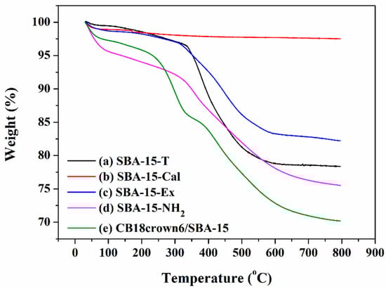 Figure 3 shows the TGA curves of SBA-15-T, SBA-15-Cal, SBA-15-Ex, SBA-15-NH2, and CB18crown6/SBA-15. Comparing Figure 3a–c, the SBA-15-T shows the greatest weight loss due to the degradation of the template P123 around 300 °C. The SBA-15-Cal in Figure 3b, where P123 was removed at high temperature by calcination, showed the highest thermal stability and no noticeable loss in weight. The weight loss up to around 100 °C resulted from the evaporation of the physisorbed water on the surface of the mesoporous materials. The SBA-15-Ex in Figure 3c displayed reduced weight loss compared to that of the SBA-15-T and greater weight loss than that of the SBA-15-Cal, due to the degradation of the remaining P123 and the silanol groups on the surface. Meanwhile, after grafting APTES onto the SBA-15-Ex, the weight loss of the SBA-15-NH2 increased to 25% due to the degradation of the organic moieties in SBA-15-NH2, owing to the presence of APTES. For CB18crown6/SBA-15, the weight loss further increased to 30% due to the decomposition of CB18crown6. It is notable that the residue contents of SBA-15-Ex, SBA-15-NH2, and CB18crown6/SBA-15 were 82.3, 75, and 70%, respectively, indicating that the content of APTES and CB18crown6 grafted to the surface of SBA-15-Ex was approximately 7.3 and 5%, respectively. These phenomena indicate the successful grafting of the CB18crown6 ligand onto the SBA-15.