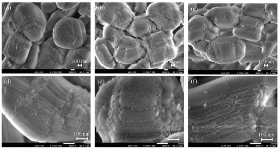 The morphology and microstructure of the SBA-15-Ex, SBA-15-NH2, and CB18crown6/SBA-15 can be observed via FESEM (Figure 4). The synthesized SBA-15-Ex exhibited uniform, hexagonal, rod-like particles and uniform pore channels (Figure 4a,d). After modification, the morphologies of SBA-15-NH2 and CB18crown6/SBA-15 did not change much (Figure 4b,c). In addition, a well-ordered parallel mesochannel could also be identified, even when the APTES and CB18crown6 were attached to the SBA-15, as shown in Figure 5e,f.