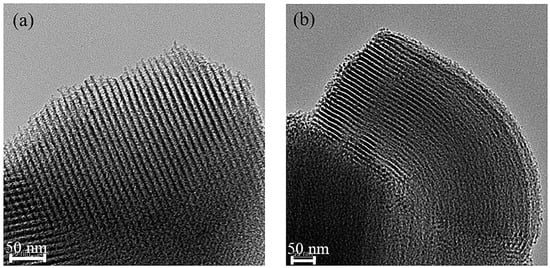 Figure 5a,b show TEM images of the SBA-15-Ex and the CB18crown6/SBA-15, respectively. The TEM image revealing the well-ordered mesoporous channels of the SBA-15 was well maintained even after modification with CB18crown6. In addition, combined with the BET data that will be discussed later, the TEM images may also indicate that the diameter of the channels of CB18crown6/SBA-15 was slightly lower than that of SBA-15-Ex. This result confirms that the CB18crown6/SBA-15 adsorbent with uniform mesopores was successfully prepared, which will be beneficial to the performance of the adsorbent.