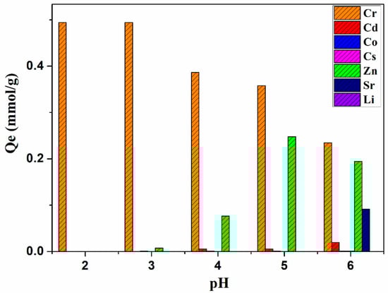 To further study the practical applicability of CB18crown6/SBA-15, the adsorption efficiency of the adsorbent for metal ions in the aqueous solutions containing seven metal ions—chromium, zinc, lithium, cadmium, cobalt, strontium, and cesium ions—was measured. Competitive metal ion adsorption was performed in the pH range 2–6 in a batch experiment with a mixture of all seven metal ions at concentrations of 0.5 mmol/L of each metal ion at 25 °C. The removal efficiency of each metal ion from the mixed solution is shown in Figure 8. Cr(VI) showed high adsorption at pH 2 and 3, while at pH 5–6, Zn(II) adsorption was also detected. However, other metal ions such as Co, Cs, Cs, Sr, and Li ions were not adsorbed or marginally adsorbed. In addition, above pH 7–8, it was difficult to measure adsorption accurately, because the metal ions were precipitated (Figure 9b); for example, Zn2+, Cd2+, and Co2+ may form metal hydroxides or salts under alkaline conditions.