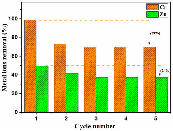 When industrial water containing metal ions and heavy metal ions is released into nature, the contaminated water causes damages to various lifeforms, and eventually affects humans [1,2]. For instance, zinc can cause abdominal pain, vomiting, and headache, and is considered to be hazardous to human health and the environment [3], while the presence of hexavalent chromium (Cr(VI)) in water may cause ailments such as skin allergy, bronchial and liver damage, and kidney failure due to its frequent occurrence and toxicity to living organisms [3]. Thus, removal of metal ions from contaminated water is essential. Over the decades, several methods have been devoted to removing metal ions from aqueous solutions via various techniques, such as adsorption, ion exchange, sedimentation, and membrane processes [4,5,6,7]. Amongst them, adsorption is a convenient technique to remove metal ions from aqueous solutions, with the advantages of low cost, high efficiency, easy operation, and low secondary pollution impact [8].
