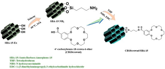 In addition, most crown ethers do not contain functional groups, so it is difficult to graft them to other materials by covalent bonding [18,20,21,22]. For instance, Awual et al. [18] reported that the fabrication of a mesoporous adsorbent by direct physical immobilization of dibenzo-30-crown-10-ether (DB30C10) to a mesoporous silica substrate. However, crown ethers mixed with inorganic mesoporous silica without covalent bonding, but simply via physical blending, are likely to cause the elution of effective crown ether during the adsorption process. Thus, the choice of a crown ether is quite important for effectively introducing it to SBA-15. 4′-Carboxybenzo-18-crown-6 containing a carboxyl group was selected in this work, since a dehydration condensation reaction occurs with the amino group to form an amide bond under the action of the activator. The SBA-15 was modified with (3-aminopropyl) triethoxysilane (APTES) to make the surface of SBA-15 contain an amino group. Thanks to the choice of modifying agent, the amines present in the modified SBA-15 (SBA-15-NH2) can combine well with the carboxyl group. For more effective bonding of the carboxyl group with the amino group, 4′-carboxybenzo-18-crown-6 was added with N-hydroxysuccinimide (NHS) and 1-(3-dimethylaminopropyl)-3-ethylcarbodiimide hydrochloride (EDC) to enable the carboxyl group to change into the initiating mode and then react effectively with the amino group on the SBA-15-NH2.