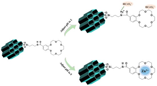 In addition, when the pH increased, selective adsorption of zinc ions was also observed. Deb et al. [46] reported that the poly(methyl acrylate) (PMA) resin functionalized with dibenzo-18-crown-6 (DB18C6) showed the binding of zinc ions to the oxygen ring of the crown ether. Thus, the CB18crown6/SBA-15 was able to adsorb zinc ions with the same number of oxygen rings in the crown ether. The diameter of the CB18crown6 in this work was ~2.6–3.2 Å [47]. The diameter of zinc ions is 1.48 Å, which is relatively smaller than that of CB18crown6, and seems not to match with the latter. However, according to previous reports, although zinc ions are too small to fit into a single cavity, there is a tendency for Zn(II) ions to form a “sandwich’’-type complex with adjacent crown units of CB18crown6/SBA-15 [48]. After grafting CB18crown6 onto the surface of SBA-15-NH2, the mesoporous surface contains a large number of crown ether groups—especially adjacent crown ether groups—so that Zn(II) ions are complexed by CB18crown6 in a sandwich-type complex and form the crown ether–metal ion complex with a 2:1 ratio, leading to selective adsorption of zinc ions. The adsorption capacities of other metal ions were very small or did not show adsorption performance, indicating that their diameter does not matching the cavities of CB18crown6 (for example: the sizes of these ions are Cd2+ ~1.94 Å, Li+ ~1.2 Å, Cs+ ~3.8 Å, and Sr2+ ~2.36 Å) [49]. Despite the diameter of Co2+ (1.44 Å) being similar to that of Zn2+ ions, according to the previous research carried out in our laboratory, Zn2+ is believed to diffuse in silicon mainly via an interstitial–substitutional mechanism, where this interstitial–substitutional-diffusing Zn2+ regularly “kicks out” a Si atom and assumes a substitutional position in the course of the diffusion process. Therefore, it exhibits strong selective adsorption of Zn2+, even in multicomponent metal solutions containing Ni2+, Li+, Co2+, Cd2+, and Zn2+ [50]. With regard to the adsorption selectivity of CB18crown6/SBA-15 for Zn(II) metal ions, in addition to the extent to which the ion size matches that of the CB18crown6 cavities, the binding energy and Gibbs free energy difference of the hydration process for these ions also play a major role in the selectivity, and this merits further investigation. As Deb et al. [46] reported, the substantial negative values of binding energy as well as Gibbs free energy indicate that the crown-ether-appended polymeric resin exhibits excellent adsorption performance for Zn(II) ions [51]. In addition, it may also be slightly negatively charged under roughly neutral pH conditions, which is favorable for the removal of positively charged Zn(II), while under lower pH conditions, H+ may compete with Zn(II); thus, as the pH decreases to 2, its adsorption performance weakens. The possible mechanism of adsorption of Cr(VI) and Zn(II) by CB18crown6/SBA-15 is illustrated in Scheme 2. CB18crown6/SBA-15 mainly shows the removal of Cr(VI) and Zn(II) at different pH levels. At pH 6, CB18crown6/SBA-15 shows a small amount of adsorption of Sr2+. The adsorption of Sr2+ onto CB18crown6/SBA-15 is also possible through complexation of the oxygen atom inside CB18crown6/SBA-15 with Sr2+. As discussed above, the diameter of Sr2+ is 2.36 Å—larger than that of Cd2+, Co2+, and Li+—while the diameter of Cs+ is larger than that of CB18crown6. Therefore, Sr2+ is relatively easy to complex with CB18crown6 compared to the ions mentioned above, leading to a display of marginal adsorption performance.