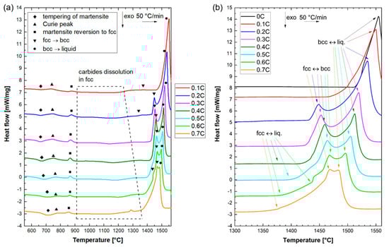 In the high-temperature range relevant to melting, at least two overlapping endothermic peaks can be identified in the DSC traces of 0.2C–0.7C alloys. These peaks are attributed to the formation of ferrite (triangles pointing downwards in Figure 1a) and liquid (circles in Figure 1a). The peak due to the formation of liquid was broader than the ferrite formation peak, and exhibited a maximum at a higher temperature. Depending on the carbon concentration, melting started either by the direct liquification of austenite (alloys 0.4C–0.7C) or by liquid formation, subsequent to the partial formation of ferrite (0.2C and 0.3C alloy). In the latter case, the partitioning of carbon between austenite and ferrite, and the changes in the relative stability of austenite and ferrite relative to the liquid phase, is expected to have influenced the onset of melting in each phase.