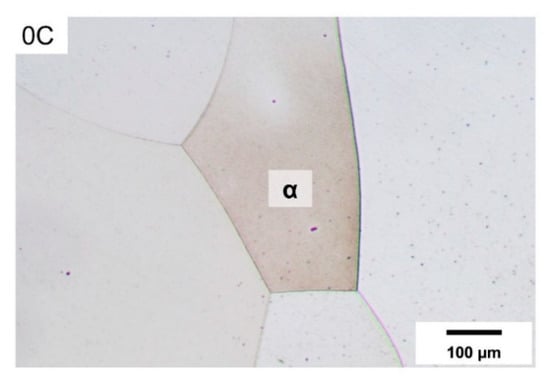 Within the temperature range shown in Figure 1b, the binary alloy 0C only exhibits a single endothermic peak, starting at nearly 1510 °C. Based on the optical microstructure of the 0C alloy in Figure 2, this alloy exhibits a fully ferritic microstructure at RT. Accordingly, an inspection of the DSC trace at lower temperatures indicated no peaks other than the endothermic peak, due to the ferromagnetic-to-paramagnetic transition of ferrite (Curie temperature peak, Tc) in the vicinity of 730 °C. In the absence of phase transformations in the solid state, the peak centered about 1550 °C is due to the melting of ferrite and indicates ferritic solidification during the reverse process of cooling from the liquid range.