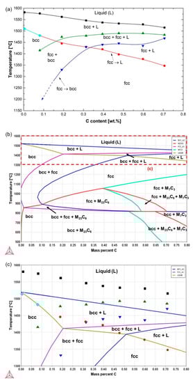 Based on the sequence of transformations during heating into the liquid range, the following implications can be made with regard to the melting process in reverse, namely, solidification. In all alloys, solidification begins with the formation of ferrite. For the 0C and 0.1C alloys, solidification completes without austenite formation, namely, a single-phase ferritic (F) solidification mode [43]. For the 0.2C–0.7C alloys, on the other hand, some austenite is formed in the solidification range, namely, a ferritic–austenitic (FA) solidification mode [44]. Austenite can form directly from liquid (liquid → fcc) or ferrite (bcc → fcc), or from both of them via a peritectic reaction (liquid + bcc → fcc). In the case of 0.4C–0.7C alloys, the final stage of solidification only involves the formation of austenite, namely, liquid → fcc or liquid + bcc → fcc.