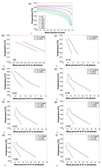 For an estimate of the extent of Cr segregation during solidification, the Scheil module of Thermo-Calc was used. Figure 4b–i show the evolution of the instantaneous Cr concentration in phases during the solidification of all alloys. The results were obtained by applying a cooling rate of 10 °C/s and corresponding to the solidification temperature ranges given in Figure 4a. For each alloy, the Cr concentration of liquid at the respective liquidus temperature indicates its average Cr concentration. Since both ferrite and austenite phases form with a lower Cr concentration than the coexisting liquid, the Cr concentration of liquid constantly increases during the solidification. In the case of the 0.3C–0.7C alloys, the solidification mode is ferritic–austenitic according to Thermo-Calc calculations. Given the lower solubility of Cr in austenite than in ferrite, the Cr enrichment of liquid accelerates in the case of austenite formation. The gradual Cr enrichment of liquid in turn leads to an enrichment of interdendritic regions with respect to Cr. If the last residues of liquid, which are frozen into solid without much change in the chemical composition, are neglected, the segregation ratio for Cr can be calculated based on the maximum and minimum Cr concentrations in solid phases, . In the present case, a threshold liquid fraction of 1% was used for the calculation of segregation ratios. The Cr concentrations in both ferrite and austenite phases were considered. Segregation ratios in the range of 1.09–1.54 were obtained in the present alloys. These values are not as large, for example, as the values reported by Kato et al. [51] or Kozeschnik [50], where segregation ratios up to 5 or 2.5 were obtained for Fe–1.5Cr–1C and Fe–1.5Cr–0.7C steels, respectively. Due to the homogenization of alloys prior to DSC measurements, chemical composition inhomogeneities in the specimens used for the DSC measurements are expected to be significantly lower than those based on the present Scheil calculations.