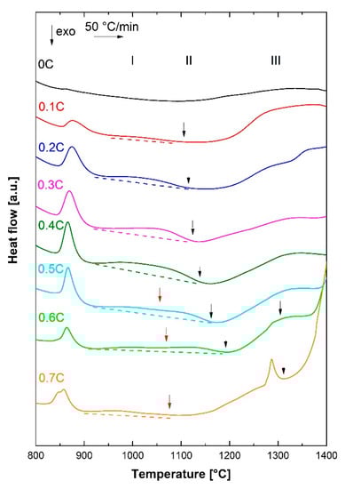 In spite of the inaccuracies arising from the identification of the baseline, effort was made to identify temperatures associated with the full dissolution of carbides. The black arrows in Figure 5 mark the approximate end of the endothermic peaks, namely, temperatures associated with the full dissolution of carbides. For the steels 0.1C–0.5C, only one broad endothermic peak could be identified, which is expected to be related to the dissolution of M23C6 as the most dominant carbide in martensitic stainless steels such as the AISI 420 grade [42]. The thermodynamic stability of M23C6 can also be implied from the equilibrium phase diagram in Figure 3b. In the case of the 0.5C alloy, the broad endothermic peak shows a mild discontinuity, which is marked by a red arrow in Figure 5. Such a discontinuity is also evident in the case of the 0.6C alloy and might even exist in the DSC curve of the 0.7C alloy, at the temperature marked by a red arrow, but have remained unnoticed due to the particular progression of the baseline. The discontinuity is expected to be related to a change in the type of carbides, for instance, M23C6 to M7C3 transformation [26], as also implied from the equilibrium phase diagram at high carbon concentrations. In the case of the 0.6C alloy, another weak endothermic peak emerges shortly below 1300 °C and ends at the temperature marked by a second black arrow. By analogy with [56], this peak is thought to be related to the dissolution of M7C3 carbides, especially carbides that might have been present and coarsened at the homogenization temperature of 1200 °C. This interpretation is supported by the higher intensity of the latter peak in the case of the 0.7C alloy, whose end marks the full dissolution of all types of carbides.