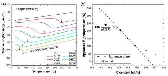 Dilatometry measurements were conducted to determine the Ms temperatures. By neglecting the differences in the Cr concentration of alloys, it will be possible to determine the carbon concentration dependence of Ms temperature in the current alloy system and make a comparison with the literature data. For this purpose, dilatometry specimens were cooled from 1180 °C at a rate of 20 °C/s. The latter temperature was the upper temperature limit of the dilatometer used for the present dilatometry experiments. Relative length changes during the cooling segment are shown in Figure 6a. Except for the austenite-free 0C alloy, all the alloys exhibited a remarkable deviation from near-linear thermal contraction at temperatures below 400 °C. The Ms temperatures, determined by the method described in Section 2, are marked by arrows in Figure 6a.