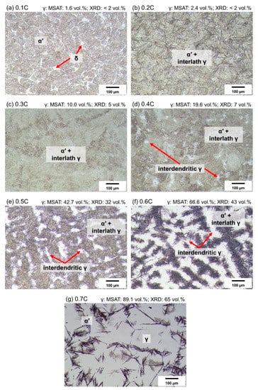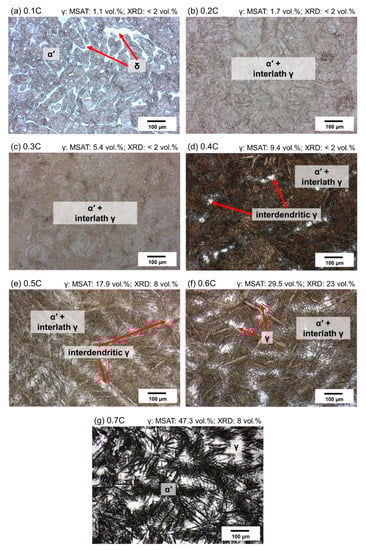 (a–g) Optical micrographs of 0.1C–0.7C alloys quenched to RT and etched with Beraha I solution. Numbers above optical micrographs denote phase fractions based on magnetic (MSAT) and XRD measurements, respectively.