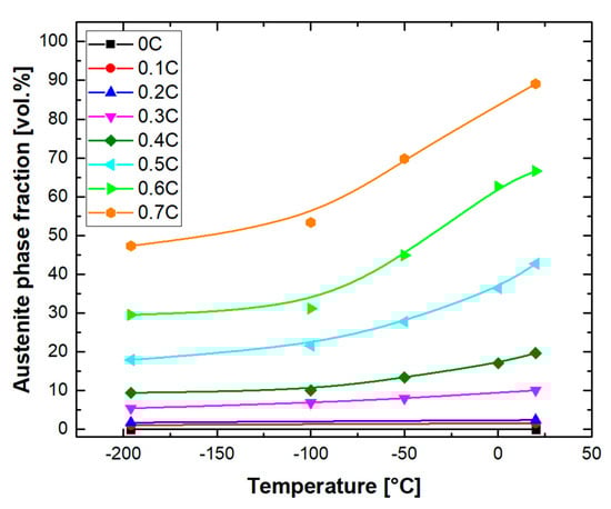 Figure 8 shows optical micrographs of alloys after quenching to −196 °C. According to the microstructures, martensite fractions are higher than those after quenching to 20 °C [70]. For the 0.1C alloy (Figure 8a), the microstructure consists of martensite and δ-ferrite, which resembles that observed after quenching to 20 °C (Figure 7a). For the 0.2C alloy as well, the difference between the austenite fraction obtained after quenching to 20 °C (Figure 7b) and −196 °C (Figure 8b) remained negligible. For the rest of the alloys, an increase in the martensite fraction after quenching to −196 °C was noticeable. Figure 9 summarizes the evolution of the austenite fraction in all the alloys after quenching to various temperatures between 20 °C and −196 °C. The reduction in the austenite fraction at lower temperatures can be explained by the increase in the thermodynamic driving force for martensite formation [36,71,72,73]. Koistinen and Marburger [74] have proposed an empirical equation to describe the non-linear increase in the martensite fraction at temperatures below the Ms temperature. The curves in Figure 9 flatten at cryogenic temperatures, implying a more sluggish increase in the martensite fraction. The stabilization of austenite at cryogenic temperatures has been justified by the decrease in the thermodynamic driving force for the martensite formation in the vicinity of the Néel temperature [36,72]. To restrict the thermal stabilization of austenite [75,76], due to holding at 20 °C, quenching to target temperatures below RT was conducted immediately after quenching in water at 20 °C.