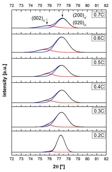 By Rietveld refinement of XRD patterns, the lattice parameter of constituent phases in alloys, after quenching to RT, was determined. At high carbon concentrations, the martensite peaks indicated clear tetragonality of the unit cell. This is demonstrated by diffraction patterns in the range 2θ = 72–82°, which covers the occurrence range of {002}α′ peaks (Figure 10). As the carbon concentration increases, the relative intensity of the (002)α′ peak increases at the expense of the (200)α′ and (020)α′ peaks. Gaussian fits to these two peaks are superimposed in Figure 10. Peak splitting is noticeable at carbon contents equal to or larger than 0.2%, which agrees with the reported minimum carbon level for a detectable martensite tetragonality [77,78].