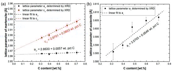 where refers to the carbon content in wt.%, and , and are the lattice parameters in angstrom. The validity of these three equations is limited to carbon contents between 0.313 and 0.706%. In Figure 11b, the deviations in the lattice parameters of austenite in XRD measurements from a linear relationship are very clear. In materials with an fcc crystal structure and a low stacking fault energy, an anisotropic (hkl)-dependent peak shift takes place [82]. In other words, some lattice planes experience an expansion, whereas some others are contracted, which is due to the presence of stacking faults. This causes the XRD peaks for austenite to shift to smaller or larger angles relative to their ideal position in the absence of stacking faults [57], thereby increasing the error in the lattice parameter quantification by full-profile fitting. Therefore, the presence of stacking faults is a likely explanation for the large error associated with the quantification of the austenite lattice parameter in the present steels.