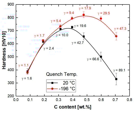 As the carbon concentration exceeds 0.4%, the hardness starts to decrease. The decrease in hardness occurs in spite of further increase in the lattice microstrains in martensite, as evidenced by the increased tetragonality of martensite (Figure 11a). A similar decrease in hardness occurs for as-quenched carbon steels at carbon concentrations above 0.9%. This is known to be related to the presence of retained austenite [84]. In the present case, the decrease in hardness begins as the retained austenite content exceeds 20 vol.%. Not only the fraction of retained austenite, but also its mechanical stability, are decisive to the hardness of steels with martensitic–austenitic microstructures [13,85]. The observation of a hardness of only 330 HV10 for the 0.7C steel consisting of 89.1 vol.% austenite indicates that the mere solid solution strengthening of austenite by carbon is much weaker than that of martensite. In practice, an increase in the carbon concentration of austenite is expected to lower its strength further, by raising its stacking fault energy [86], and, thereby, its mechanical stability [87]. The deformation-induced martensite formation as an effective strain hardening mechanism is then delayed, resulting in a decrease in hardness [88]. The ready transformation of austenite with a low mechanical stability, on the other hand, enhances the strength. Phase-specific nano-indentation measurements of a Q&P steel containing austenite with a low stability against deformation-induced martensite formation have indicated comparable hardness values for both martensite and austenite constituents [89].