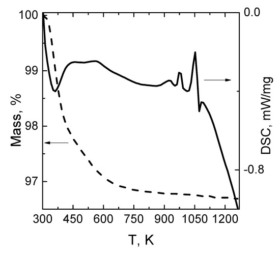 The result of TGA/DSC measurements of the 8 t composite material is presented in Figure 3. A total mass loss of approx. 3% occurs upon heating up to 750 K. In the temperature range of 300–450 K, the mass loss of 2%, accompanied by a sharp minimum in the DSC curve at 360 K, is associated with the absorbed water evaporation caused by the porous structure. The slight mass loss (approx. 1%) above 450 K occurs due to the evacuation of water obtained after the acid–base interaction processes in the PBC matrix. The series of peaks on the DSC curve at 900–1100 K without gravimetric effect is associated with high-temperature interactions between PMN-0.3PT and phosphate matrix. The developed composite remains stable up to 900 K.