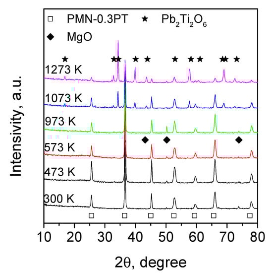 XRD analysis (Figure 4) of the as-synthesized material demonstrates the peaks from the perovskite PMN-0.3PT [01-088-1864] structure and small-intensity peaks from MgO [30-0794]. After high-temperature treatment, the intensity of the perovskite peaks gradually decreases. Additional reflections appear in the XRD spectra of samples treated at 1073 and 1273 K. These peaks are identified as pyrochlore PbTiO [26-142] cubic phase. Since both PMN-0.3PT and PBC are stable in the studied temperature range [29,40], the formation of pyrochlore phase is associated with the interaction between PBC and PMN-0.3PT at 900–1100 K (see Figure 3).