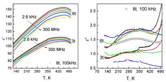 The temperature dependencies of the dielectric permittivity at different frequencies of 3 t and 6 t samples are presented in Figure 5. The results of the 8 t sample are close to 6 t, so only one frequency of 100 kHz is presented for comparison. The real part of of the studied samples demonstrates a broad maximum near 460 K. The anomaly is related to the phase transition of 0.7Pb(MgNb)O-0.3PbTiO from ferroelectric to paraelectric phase [41]. It is slightly different from the known peak position [41], which is probably due to possible defects of ferroelectric inclusions. Both samples demonstrate weak frequency dispersion of dielectric permittivity in the studied temperature range. The temperature corresponding to the maximum of is frequency independent. Dielectric losses of the samples are not higher than 2 at temperatures up to 420 K. Upon further heating, the increases up to 2.5, and the strong frequency dispersion appears (Figure 5). This may indicate the Maxwell–Wagner relaxation at higher temperatures [42].