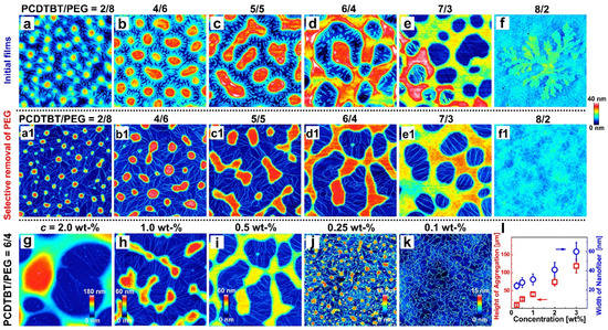 It is imperative to point out that the length of nanofibers decreased with decreasing c, probably due to the enhanced mobility of the PCDTBT molecules. Especially, for the lowest c (i.e., 0.1 wt%), only the PCDTBT nanofiber network rather than the PCDTBT aggregates were found in the washed film (Figure 2k). This morphological change may be caused by the absorption of a majority of the PEG molecules onto the hydrophilic oxidized silicon wafers, which may result in an adsorbed PEG monolayer rather than aggregates or crystals in PEG-rich domains [52]. The crystallization of PEG monolayers was predominately controlled by the diffusion of PCDTBT molecules leading to the shorter nanofibers [53,54,55].