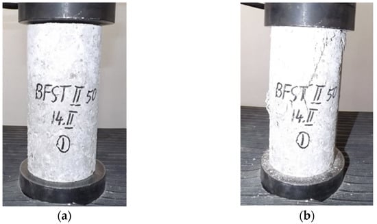 The density of the hardened concrete was determined 28 days after pouring, according to the methodology of EN 12390-7:2019 [40]. The density value was obtained by calculating the arithmetic mean of three determinations.