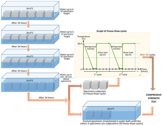 After completing 50 cycles of 4 h of freezing and 4 h of thawing, the specimens were compression tested, and the loss of compressive strength was determined.