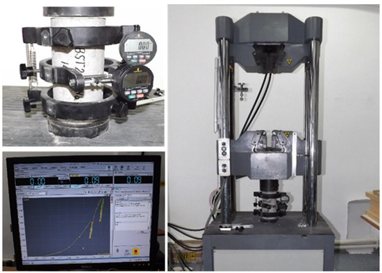 For determination of the modulus of elasticity to compression of the concrete developed in this research, method 2 of EN 13412:2006 [44] was applied, adequate for products based on cement binders. The equipment used to perform these determinations was a 100 ton hydraulic press and a compressometer/extensometer for cylinders with digital indicator, according to Figure 6.