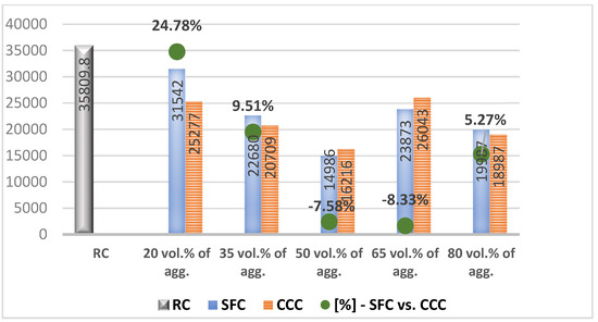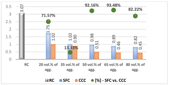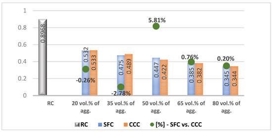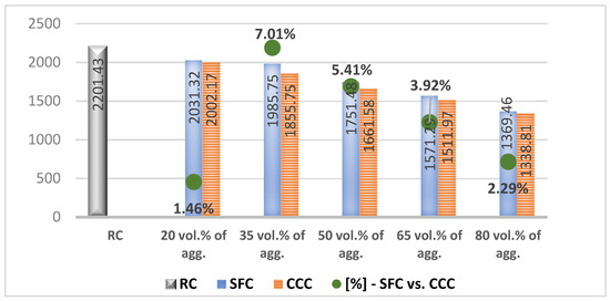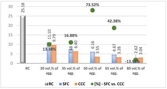 In the results analysis, we realized an interpretation of the individual values of the vegetal concretes (the columns from the Figure 7, Figure 8, Figure 9, Figure 10, Figure 11 and Figure 12) comparative to the RC value written in the beginning of each test discussion, and one of the values obtained by SFC comparative to those of CCC (the green dots from the Figure 7, Figure 8, Figure 9, Figure 10, Figure 11 and Figure 12). When these green-dot values are positive, they denote how much the SFC value is above the CCC value. When the green dots have negative values, this means how much the SFC value is below the CCC value. The comparison was performed for each replacement rate group, so SFC20 was compared to CCC20, SFC35 to CCC35, and so on.