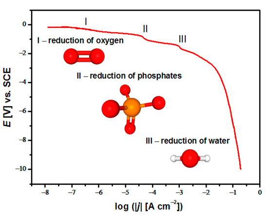 The polarization curve of the deposition of the CaP coating as a dependence of E = f(log|j|) reveals the presence of three stages, where the first stage (I) at the potential of about −0.6 V is assigned to the reduction in oxygen (1) [41,47,48]: