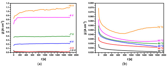 Chronoamperometric curves for ECAD of the CaP coatings on the CpTi G4 substrate in the acetate bath as a function of: (a) Deposition potential at room temperature; (b) Bath temperature at the deposition potential of −3 V.
