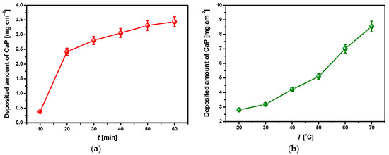 The deposited amount of CaP on the CpTi G4 substrate after ECAD in the acetate bath at the deposition potential of −3 V as a function of: (a) Deposition time at room temperature; (b) Bath temperature for the deposition time of 1800 s.