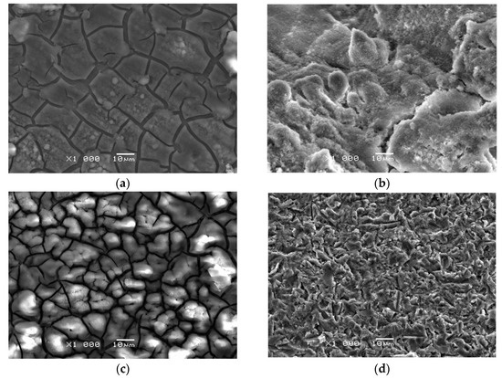 SEM image of the surface morphology: (a) CaP coating deposited at −1.5 V for 30 min at 20 °C with a thickness of 0.7(1) μm; (b) CaP coating deposited at −3 V for 30 min at 20 °C with a thickness of 11.3(7) μm; (c) CaP coating deposited at −10 V for 30 min at 20 °C with a thickness of 20.1(9) μm; (d) CpTi G4 substrate.