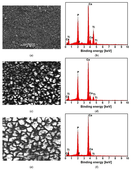 Based on the broad and diffuse X-ray diffraction pattern with a maximum at 2θ of 30, the presence of the Ca9O7P2·H2O phase was identified in the CaP coatings on the CpTi G4 surface deposited from an acetate bath [51]. The obtained results are consistent with the EDS data in Figure 6b,d,f. The long-range, periodic atomic-scale order of crystalline CaPs does not exist for ACP. In aqueous media under physiological pH and temperatures, ACP easily hydrolyzes to form octacalcium phosphate as an intermediate, and then surface apatite. ACP also reveals better in vivo osteoconductivity and biodegradability in comparison with tricalcium phosphate and hydroxyapatite [52].
