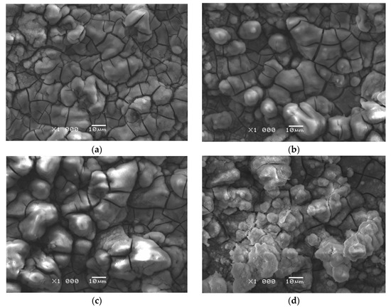 The obtained coatings show good adhesion to the porous titanium substrate. The rising temperature of the deposition bath not only increases the deposited amount of CaP (Figure 4b) but also favors the formation of larger crystallites. The obtained results are consistent with the literature data reported by Ban and Maruno [50]. As the bath temperature rises, a more island-like surface structure becomes apparent. As the deposition temperature increases, the tendency of the CaP coatings to form micro-cracks growths can also be observed. This fact may be related to the release of hydrogen bubbles during ECAD. On the coating surface obtained at the temperature of 70 °C (Figure 7d), conglomerates composed of CaP grains are present, which makes that the surface development is slightly smaller than at lower temperatures. The distribution of the fine CaP grains in the conglomerate is quite homogeneous. It means that an increase in the coatings’ deposition temperature favors the coagulation phenomenon consisting of the joining of CaP particles into larger agglomerates.
