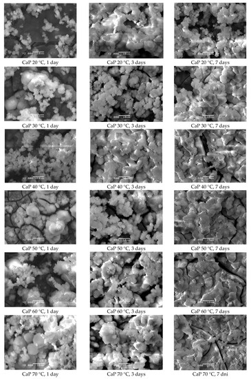 The microscopic observations showed the effect of ECAD’s temperature conditions on the surface morphology of the CaP coatings. Figure 7 presents SEM images of the surface morphology for the CaP coating deposited from the acetate bath at −3 V for 30 min at the bath temperature of 20–70 °C.