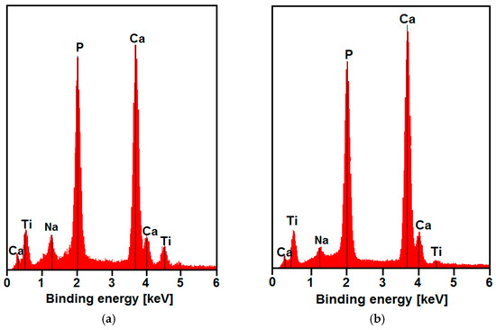 EDS spectrum after 7 days of immersion in SBF at 36.6 °C: (a) CpTi G4 substrate; (b) CaP coating deposited at −3 V for 30 min at 20 °C.