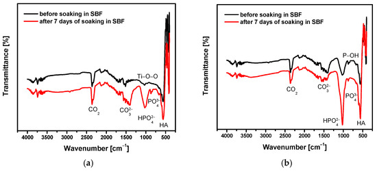Analysis of the ATR-FTIR spectrum obtained for the CpTi G4 substrate before the bioactivity test showed the presence of a TiO2-derived peak at a wavenumber of 571 cm−1, which is the result of vibrations of the Ti-O-O bond (Figure 12a). The peak at 1646 cm−1 corresponds to absorbed H2 and the peak at 2361 cm−1 is attributed to the vibrations of CO2 absorbed from the air [60]. After 7 days of soaking in SBF, HA can be clearly identified in Figure 12a. All the characteristic absorption bands of HA are present at 1021, 600, and 561 cm−1, which correspond to the and group [61]. A band ranging from 1596 to 1401 cm−1 corresponds to the group [61]. The peak at 3742 cm−1 corresponds to the O–H bonds, while the peak at 2361 cm−1 is related to the vibrations of CO2 absorbed from the air. Based on the analysis carried out on the basis of the results presented in Figure 12a and SEM/EDS (Figure 9 and Figure 11a), it can be concluded that CpTi G4 subjected to mechanical polishing, sandblasting, and sterilization shows low bioactivity in vitro. The applied surface treatment inhibits the development of natural Ap on the titanium surface.
