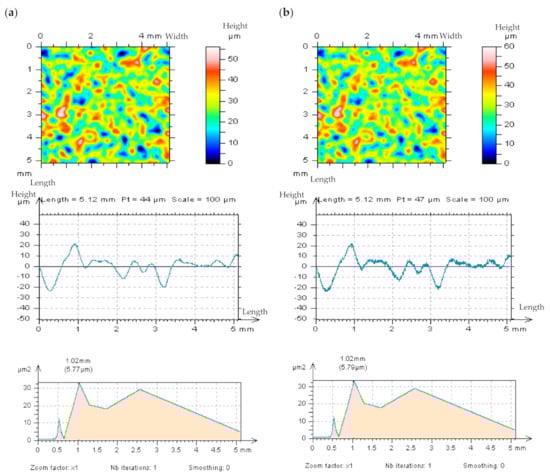 The profile (2D) parameters, from the ISO 4287 [82], were also considered, as follows: Rp maximum peak height of the roughness profile, Rv maximum valley depth of the roughness profile, Rz maximum height of the roughness profile, Rc mean height of the roughness profile element, Rt total height of the roughness profile, Ra arithmetic mean deviation of the roughness profile, Rq root-mean-square (RSM) deviation of the roughness profile, RSm mean width of the roughness profile element, Rdq root-mean-square slope of the roughness profile, Rmr relative material ratio of the roughness profile, Rdc roughness profile section height difference, RPc peak count of the raw profile.