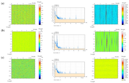 In Figure 2, certain profiles from various areas of the plateau-honed texture were presented. When the profile did not contain dimples (a), the HFN was instantaneously noticed (the small-scale frequencies were discernible). However, if features such as dimples or scratches appeared (b) noise detection became exceedingly difficult. Lastly, when the profile contained more features (usually more than 2 in 2 mm-length profiles) the errors became virtually undetectable (c). The influence of the valley diameter and depth on determining the presence of HFN in the raw measured data has not been studied. The primary purpose of the FOD analysis at this stage of research is to consider the nonfunctional details in order to simplify the analysis of profiles and their PSDs. Nonetheless, the influence of feature size on the process of noise detection should also be addressed in further studies.