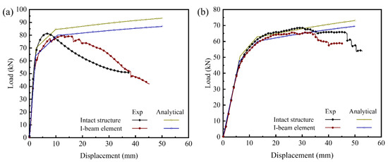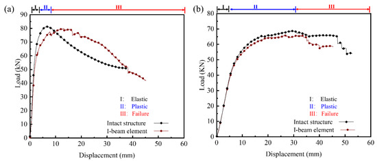 2, and the corresponding initial yield loads were 68.54 kN and 53.90 kN, respectively. Then, the slope decreased significantly with the increase in imposed displacement after the plastic bending deformation became aroused by the contact between the upper metal sheet and the indenter, and the displacement loading reaches the inflection point (stage II). The bending deformation of the metal sheets were significantly larger than the shearing deformation of the inner core. It implies that the metal sheets yielded earlier than the inner core. The plastic collapse loads of the I-beam element and intact structure were 80.15 kN and 82.29 kN, respectively, and the corresponding ratio was 97.40%.