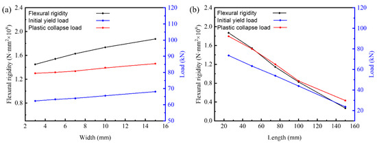 Figure 13. Considering the width range from 3 mm to 15 mm, i.e., the normalized dimension range from 0.3 to 3, the flexural rigidity, initial yield load, and plastic collapse load increase 22.08%, 9.23%, and 7.50%, respectively. It implies that width has no significant influence on the initial yield load and plastic collapse load, regardless of the flexural rigidity in the investigated range. Theoretically, the flexural rigidity increases with the increase in the I-beam width as a result of the elevated equivalent elastic modulus and shearing modulus of the panel-to-panel LTPS. However, the effective length of the metal sheet decreases slightly with the increase in the I-beam width. According to the failure criteria, the I-beam width has smaller influence on the yield and collapse of metal sheet and inner core. The flexural rigidity, initial yield load, and plastic collapse load decrease significantly with the elevation of the beam length; its decrement are 85.16%, 67.48%, and 67.69%, respectively. The equivalent elastic modulus and equivalent shearing modulus of the panel-to-panel construction decreases with the elevation of the length. As a result, the flexural rigidity decreases significantly. The effective length of the metal sheet increases with the increase in the I-beam length. Based on the failure criteria, both the initial yield load and plastic collapse load decreases. Under same normalized dimension, the decreasing amplitude stimulated by the beam length greatly exceed the increment controlled by beam width. The mechanical properties of the panel-to-panel construction are more sensitive to the beam length. In addition, the analytical models conclude that the I-beam element connected to panel-to-panel LTPS presents better mechanical performance than the intact structure when the I-beam width exceeds 12.2 mm or the I-beam length downgrades to 39.1 mm.