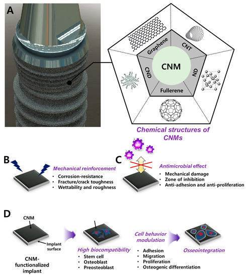 Schematic diagram of CNM functionalization on dental implants for dental tissue engineering and regeneration. (A) Graphic of CNM-functionalized implants and chemical composition of the CNM family, including graphene, CNT, CND, fullerene, and ND. Enhanced properties were demonstrated, such as (B) mechanical reinforcement, (C) an antimicrobial effect, and (D) osseointegration.