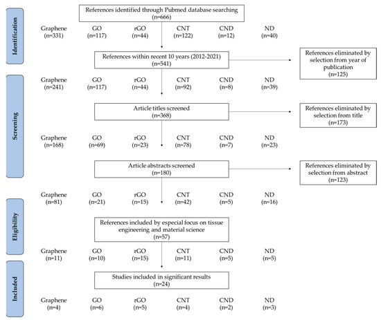 In this review, we discuss the advances in novel dental implants with CNMs in terms of tissue engineering, including material combination, coating strategies, and functionalities (Table 1). Recent studies on CNM functionalization for dental application were sorted by a PRISMA flow diagram (Figure 2). We present a brief overview of recent findings and progression in the research to show the promising aspect of CNMs for dental implant application.